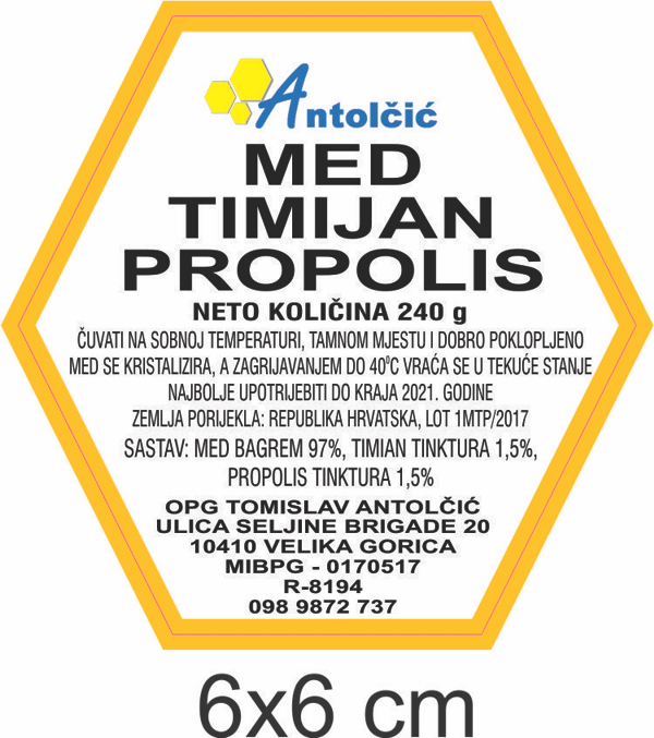 1596 – Antolčić Tomislav – 043-med timijan propolis – 240 g – 5×5 cm